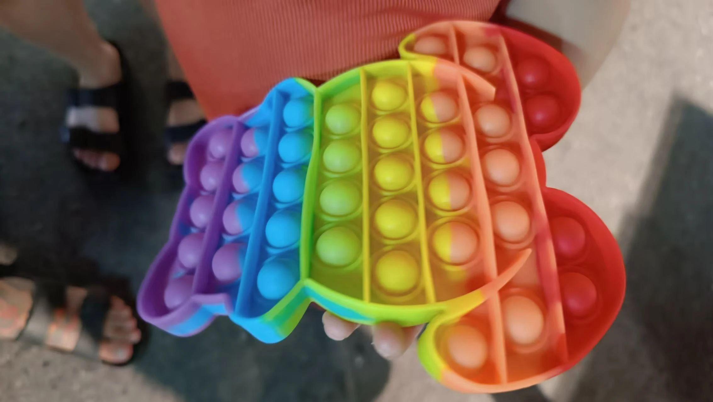 图片中主要元素是一个彩虹色的泡泡推按玩具,呈现出丰富的色彩和简单的几何形状。构图以玩具为中心,背景略显模糊,突出主体。色彩鲜艳,带来愉悦和轻松的情感表达,可能传达出童趣和放松的主题。