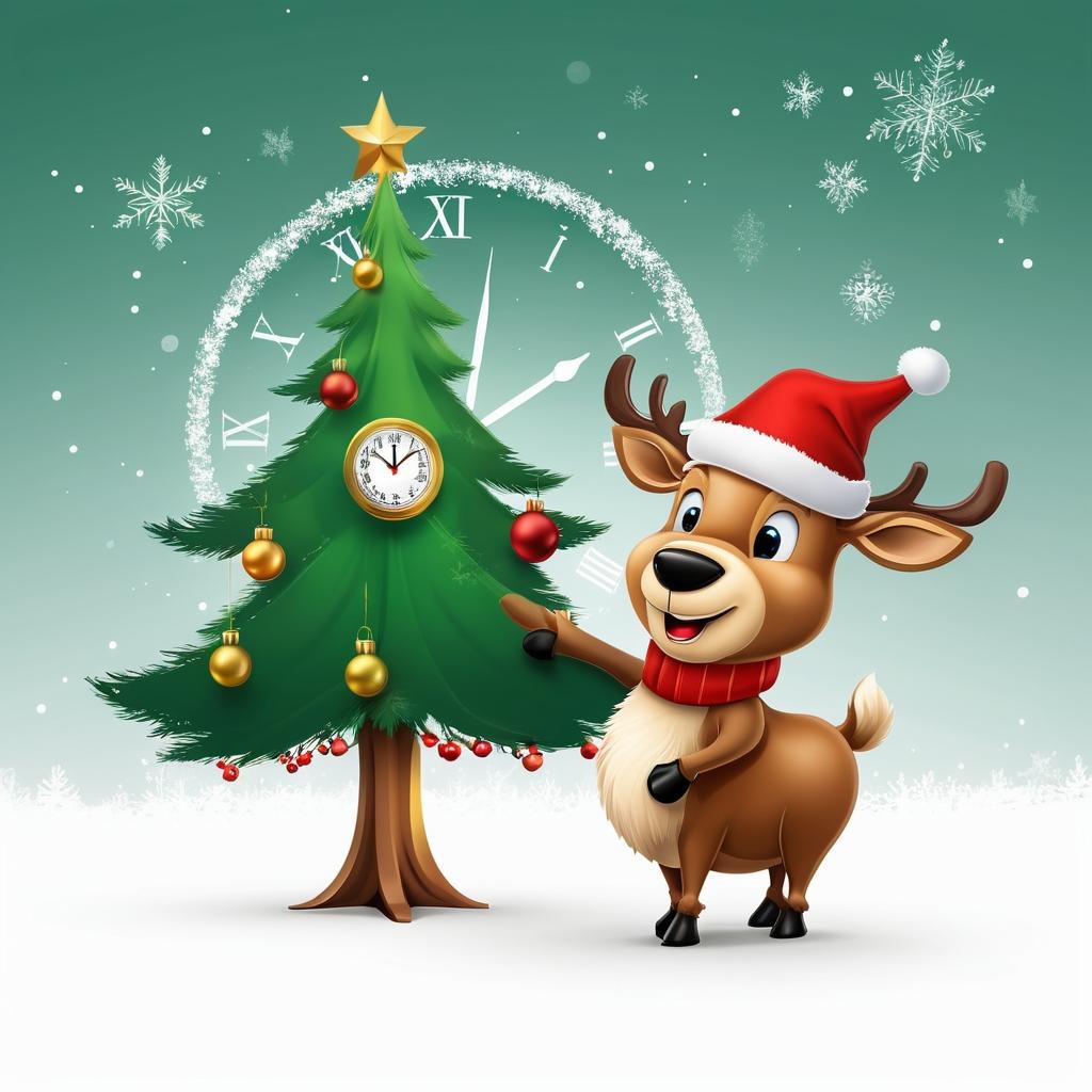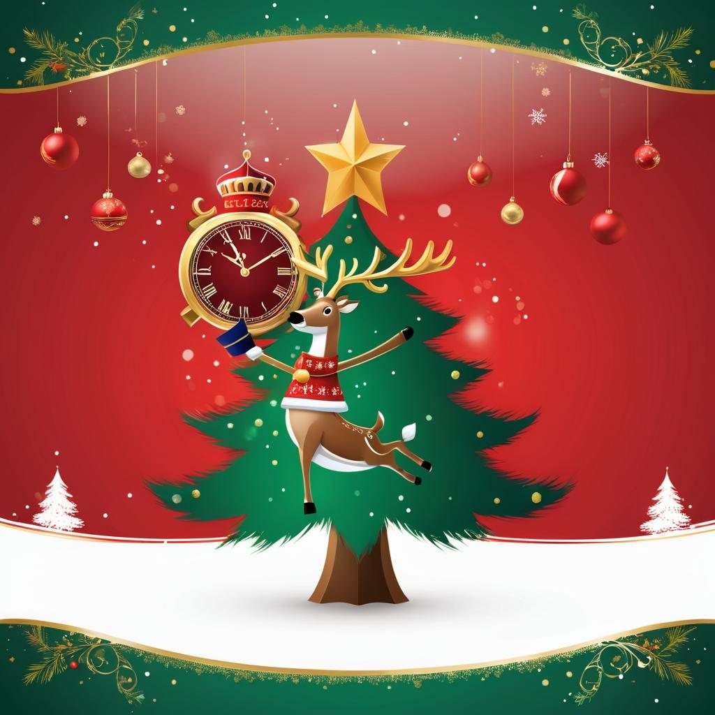 将驯鹿人物的姿态作为设计核心,添加圣诞元素,如在背景添加圣诞树、挂满灯饰的场景,增强节日氛围。可以在驯鹿手中的长物体上悬挂圣诞装饰品,时钟则可改为倒计时至圣诞节。使用红绿配色,增强画面吸引力。