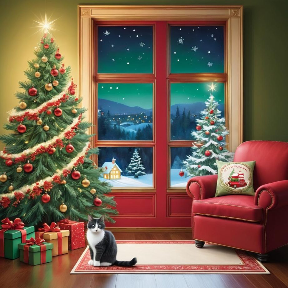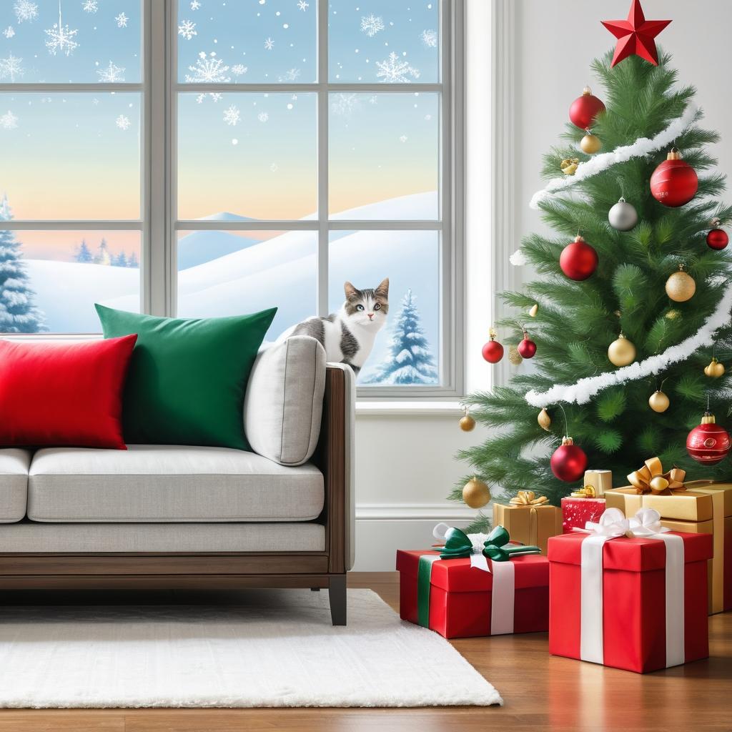 将小猫形象作为贺卡设计的中心元素。考虑为小猫添加一顶圣诞帽,使其更具节日气息。背景可以添加一个温馨的客厅场景,窗外飘雪,房内有装饰精美的圣诞树和礼物。使用柔和的灯光效果和暖色调,营造舒适的节日氛围。