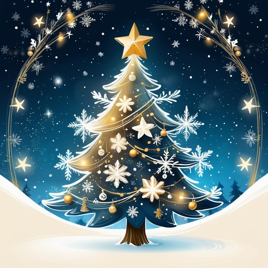 将这幅拟人化圣诞树作为贺卡设计的核心,增加背景元素,如柔和的雪花与星星点缀,营造梦幻的圣诞夜景。可以在圣诞树的’手’上添加光辉效果,让星星与花朵似乎在轻轻闪烁,增强节日的魔幻感。使用温暖的金色和柔和的白色,营造温馨的视觉享受。