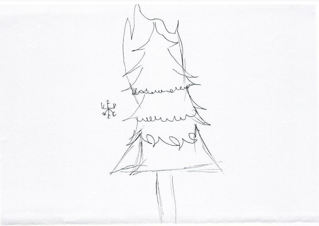 这张手稿中描绘了一棵简单的圣诞树,线条轻松随意,给人一种素朴的感觉。虽然没有复杂的细节,但树的轮廓和顶部的星星暗示了典型的圣诞元素。该图缺乏色彩和额外的节日装饰,提供了转换为圣诞卡设计的良好基础。