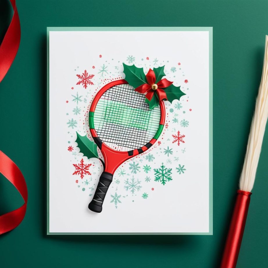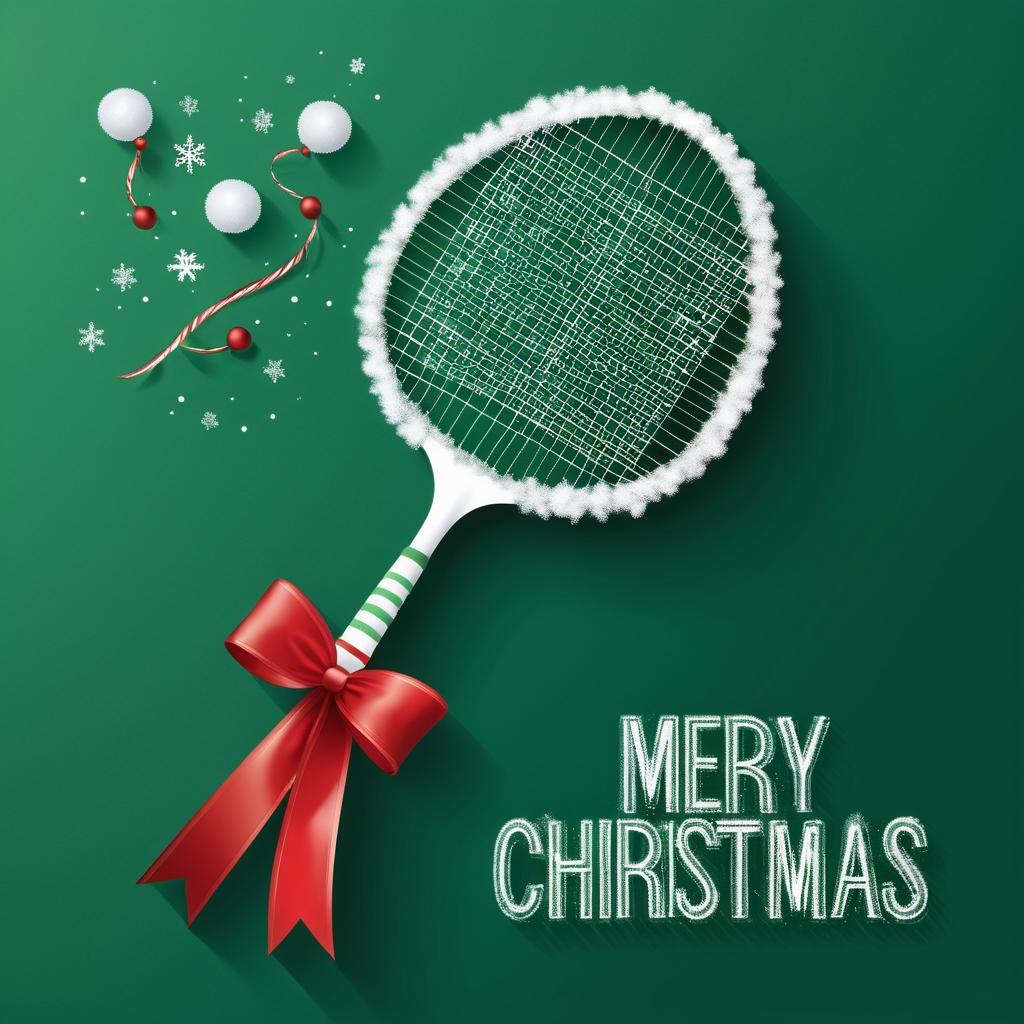 将羽毛球拍和羽毛球结合圣诞元素。可以在羽毛球拍的拍面上绘制一个微型圣诞场景,如小型的圣诞树和雪人。羽毛球可以想象成一个小雪球,周围添加雪花背景和柔和的灯光效果,营造节日氛围。