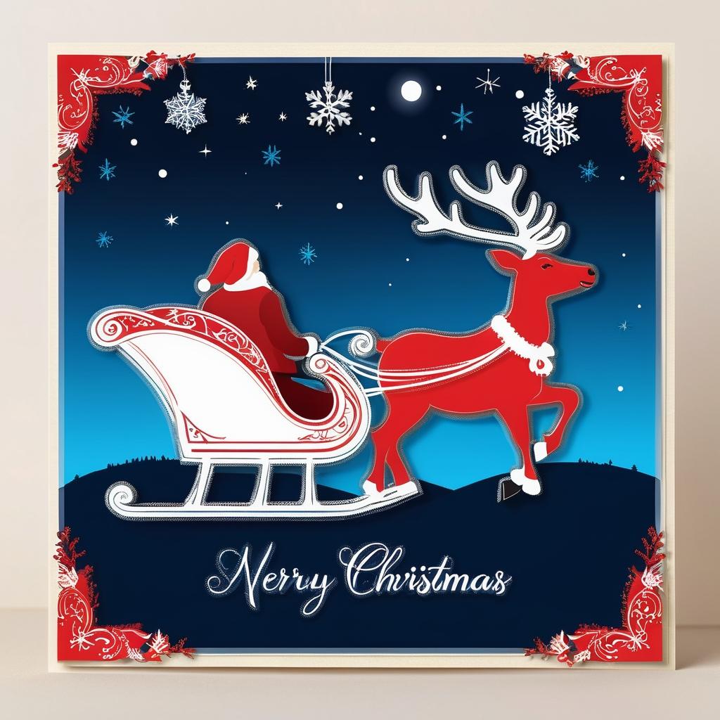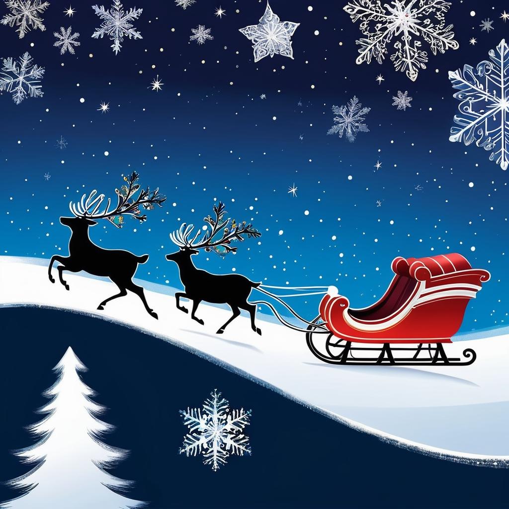 利用鹿的姿态和雪橇的元素,将其转化为充满活力的圣诞设计。可以在背景中添加星星点缀的夜空和雪花飘落的景象,以增强节日气氛。雪橇上的礼物可设计为缤纷多彩,增加惊喜感。使用暖色调的灯光效果照亮整个场景,营造温暖的节日气氛。
