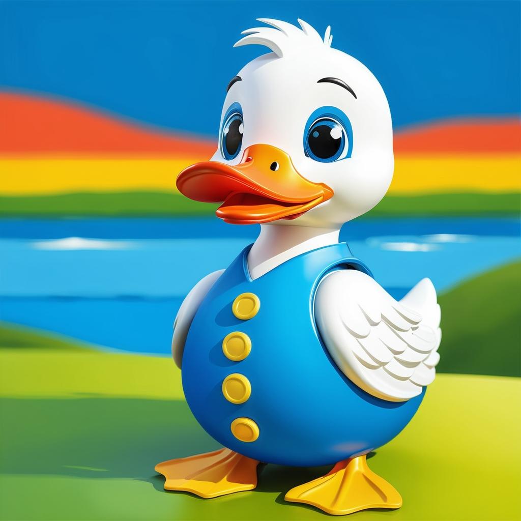 這幅作品的主角是一隻活潑可愛的玩具鴨,身穿藍色背心,為整個畫面增添了一份童趣和活力。作品的成功之處在於其鮮明的色彩運用和簡潔的背景設置,使得鴨子的形象更加突出。這樣的藝術表現不僅吸引了孩子們的注意,也喚起了成年人心中的童年回憶。