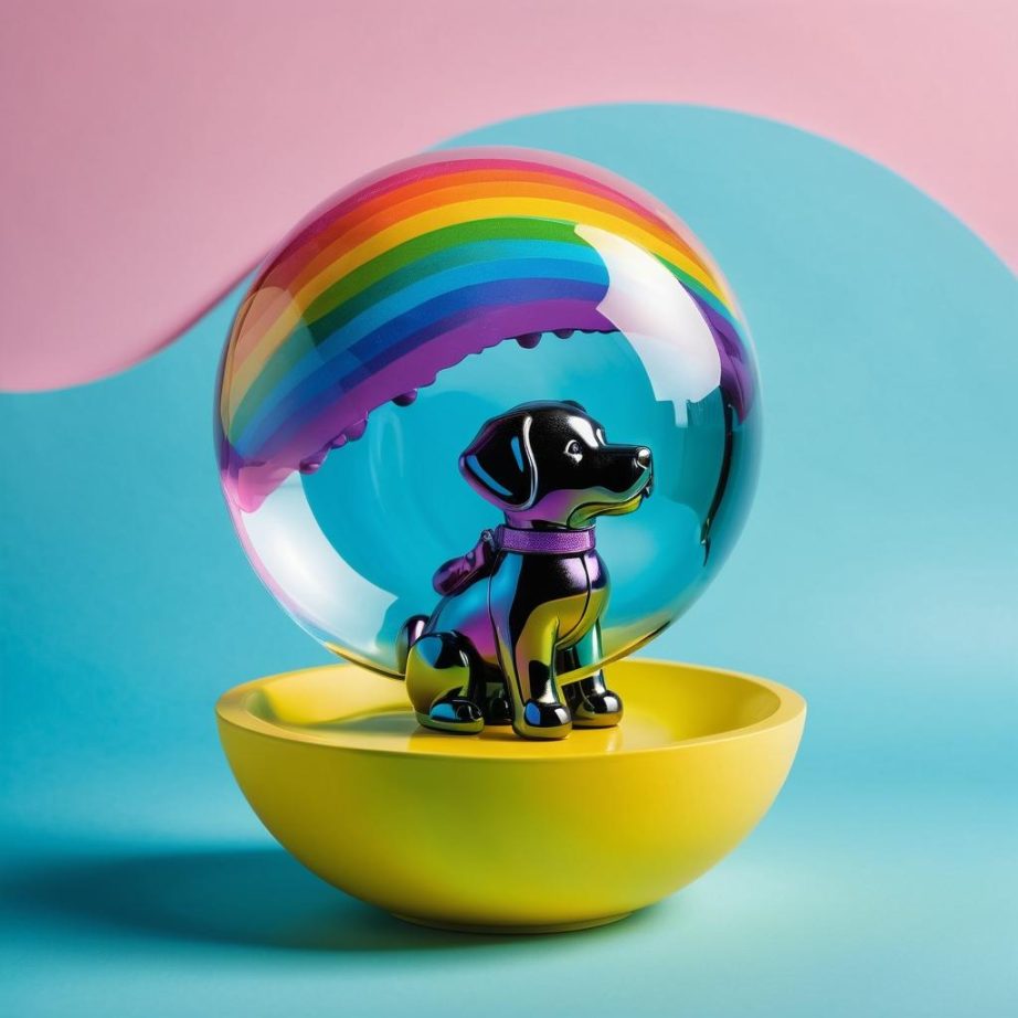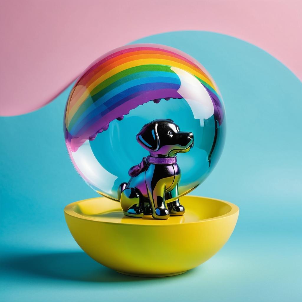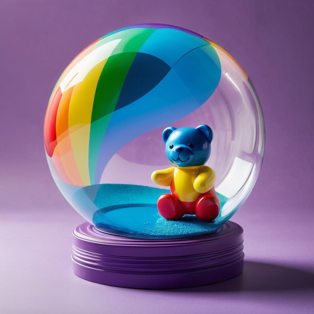 这幅作品以彩虹色的泡泡玩具为中心,展现出一种年轻、活力和趣味的感觉。色彩的运用使其具有强烈的视觉吸引力,同时也传递出一种无忧无虑的生活态度。在提升作品方面,可以考虑通过背景的设计来增加故事性,例如加入一个充满幻想的场景,使玩具成为故事中的一部分。这样可以让观众在欣赏色彩的同时,感受到更深层次的情感联系和想象空间。此外,利用光影效果来增强玩具的立体感和质感,也可以让作品更具艺术价值。