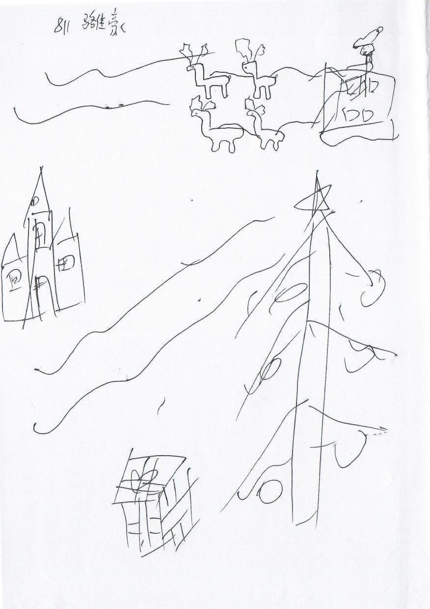 这幅手稿展示了几个具有潜在圣诞元素的图案:飞驰的驯鹿、圣诞树、礼物盒和一个房子。驯鹿和礼物盒是典型的圣诞元素,容易唤起节日氛围。房屋的尖顶设计和圣诞树的简约勾勒提供了添加细节的空间,以增强节日氛围。整体的线条简单,可以通过丰富色彩和细节进一步提升。