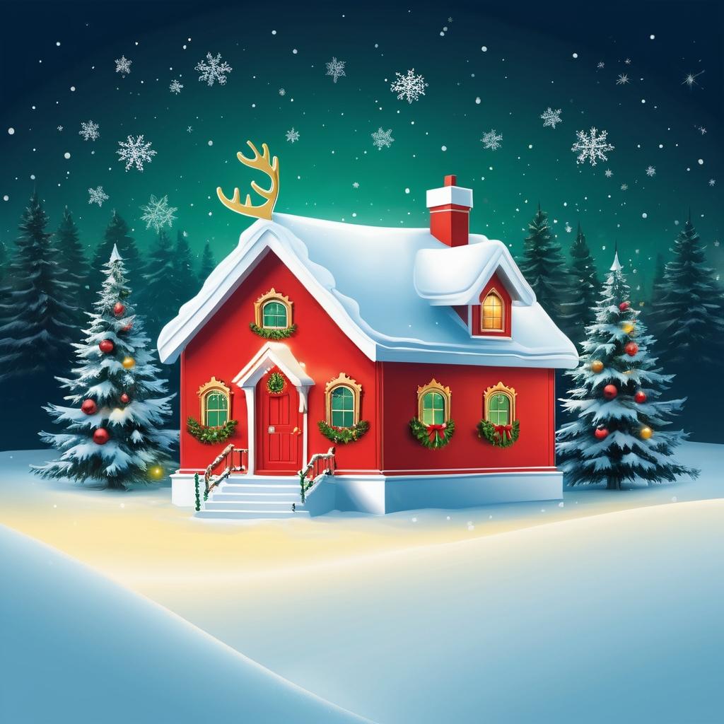 将驯鹿和礼物的元素作为画面的焦点,背景中添加装饰灯光的圣诞树和灯火通明的房子,使其呈现出宁静而温馨的圣诞夜景。可以在礼物盒上增加更多细节,如彩带和标签,增添趣味和真实感。结合柔和的雪景,营造出浓厚的节日氛围。