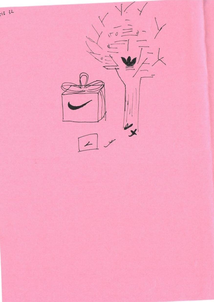 这幅图像是一张简约的手绘画,背景为粉色。图中包含一个礼物盒和一棵树的简略线条画。礼物盒上有一个蝴蝶结和标志性的图案。树的形状简单,叶子和树干用线条勾勒,树上也有一个标志图案。整体风格偏向现代极简。