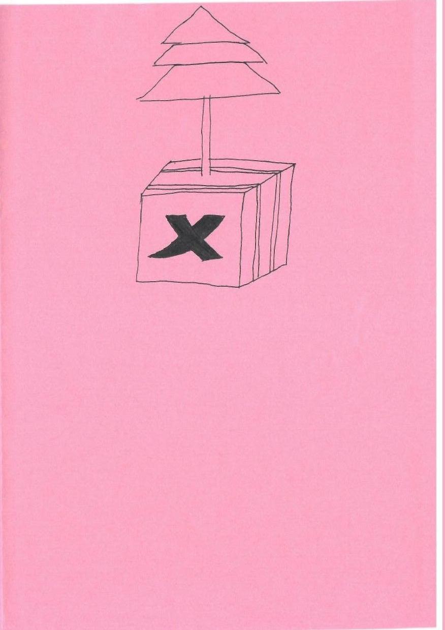 这幅作品展示了一个简单的线条绘画,呈现的是一个类似圣诞树形状的物体,位于一个方形盒子上。背景是粉红色的,没有明显的人物或节日元素。图案简洁,缺乏细节和色彩元素。线条风格干净直接,整体构图极简。