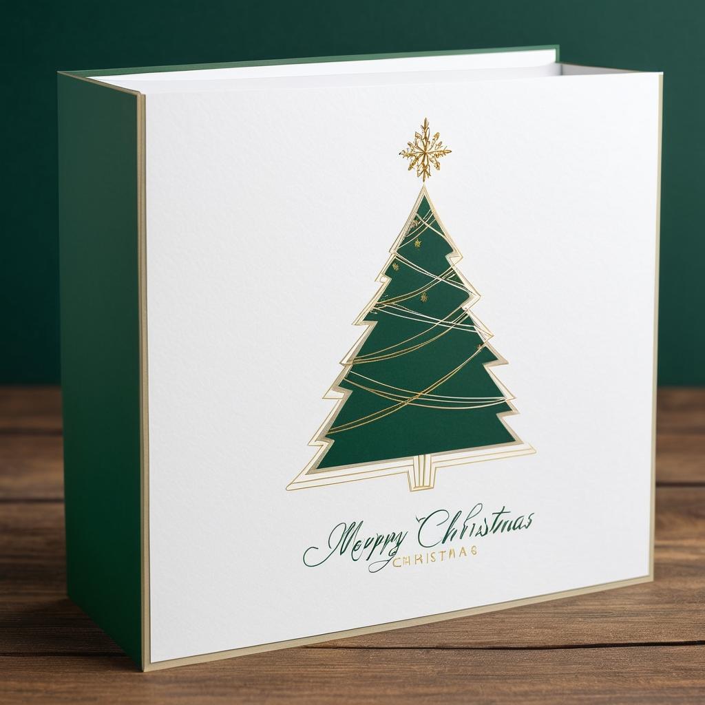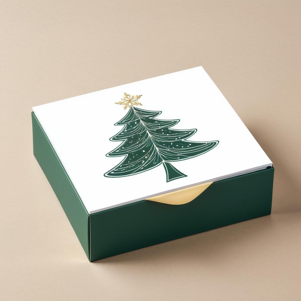 可以将这幅简洁图案转化为现代极简主义的圣诞贺卡设计。采用极简风格突出圣诞树的轮廓,使用金色和绿色来勾勒树的形状,并在背景中添加微妙的雪花图案。可以在盒子上增加一些圣诞装饰,如小型圣诞灯串,增强节日氛围。