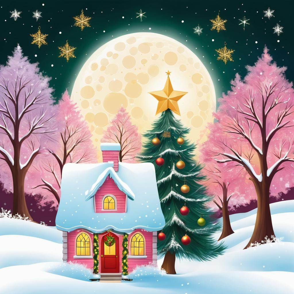 在这幅简单的手绘图中,我们看到了一个高大的树和一座房子,伴随着一个带有笑脸的太阳。尽管缺乏直接的圣诞元素,但这幅画的元素为我们提供了一个创造节日氛围的机会。通过将高大的树转化为一棵装饰精美的圣诞树,并在房子和地面周围添加雪景,我们可以轻松营造出冬日的奇境。将太阳替换为夜空中的月亮,加上星星的点缀,不仅增加了画面的层次感,还提升了节日的浪漫氛围。通过柔和的灯光效果和粉红、红、绿、金的色彩搭配,我们将这幅图转化为充满温暖与欢乐的圣诞贺卡,完美捕捉了节日的喜悦与魔力。