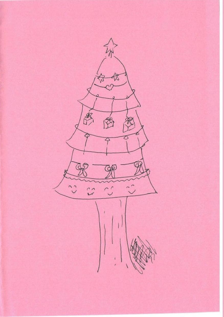 这幅作品是一幅简约的手绘圣诞树,背景为粉红色。圣诞树由线条勾勒而成,装饰有星星、心形、礼物和蝴蝶结等元素。整体风格卡通化,缺乏复杂的光影效果和色彩运用,但通过简单的线条和装饰体现了节日的氛围。没有人物元素,主要表现圣诞节特有的装饰主题。