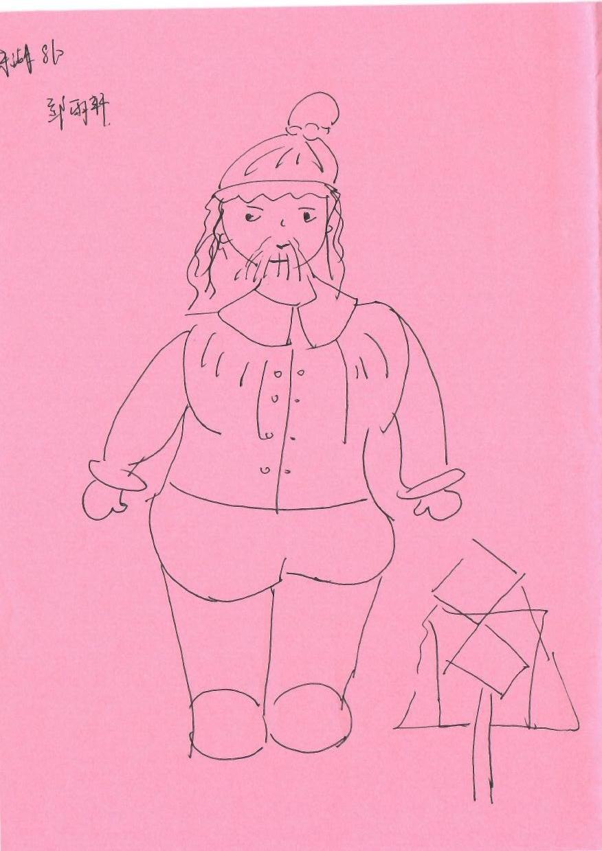 这幅手绘作品中包含一个人物角色,可能是圣诞老人,穿着传统冬季服装,头戴毛线帽。图中还有一个简单的树形结构,可能代表圣诞树。背景为粉色,缺乏明显的圣诞节日元素。建议添加更多节日特征,如雪花、闪光灯饰和礼物,以增强节日气氛。整体风格简洁,线条简单。