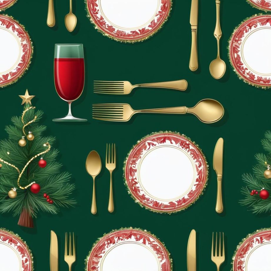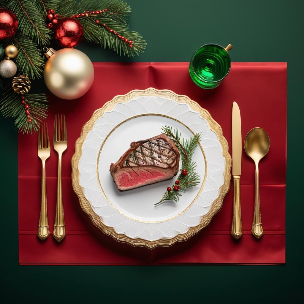 将肉排置于装饰华丽的圣诞餐桌上,添加红色和绿色的桌布和装饰品,例如小型圣诞树装饰、金色的餐具和缀满红色浆果的餐巾。背景可以设计成温暖的烛光与松枝点缀的场景,营造温馨的节日氛围。刀叉可被设计成带有圣诞元素的装饰品,增强节日气氛。