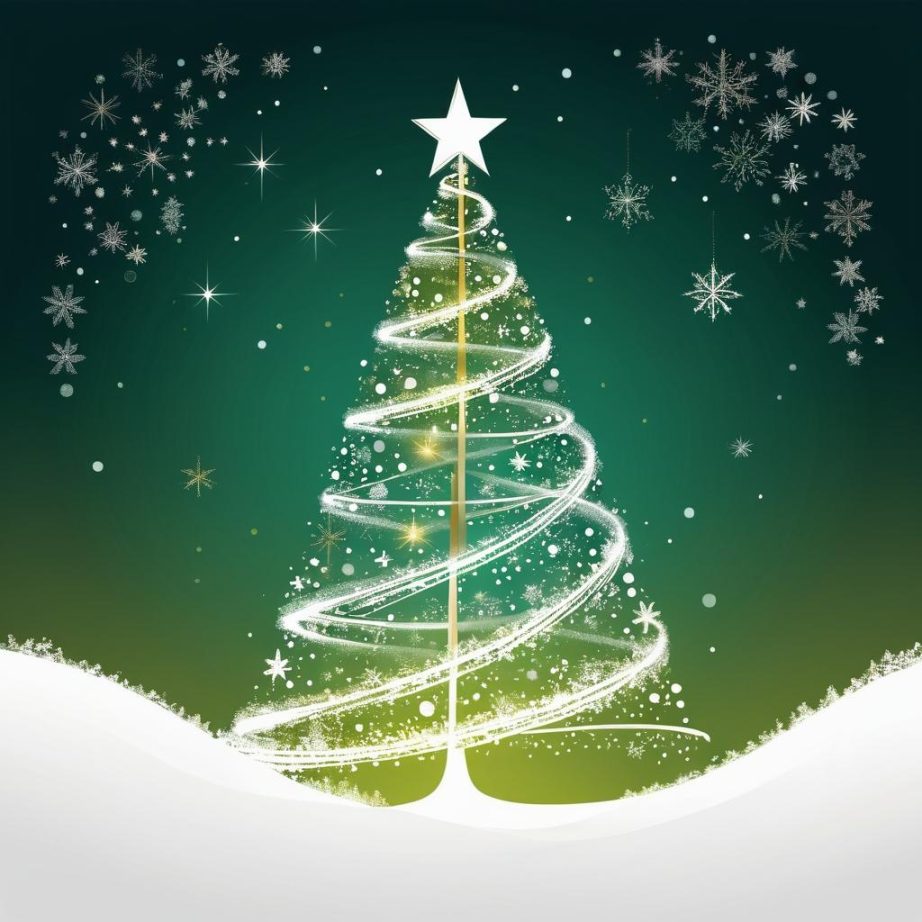 可以将螺旋状的线条强化为一棵极简风格的圣诞树,添加一些小装饰如星星和铃铛。背景可以用温暖的金色和绿色渐变来填充,营造出柔和的光晕感。可以在树的周围添加一些抽象的雪花或星光点缀,增加画面的节日感。