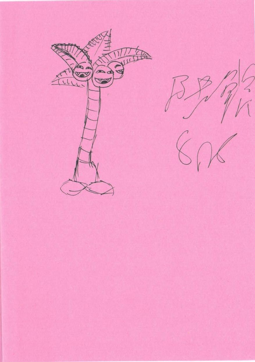 这幅作品展示了一棵带有笑脸表情的卡通风格椰子树,背景为粉红色。这种色彩和形状的组合具有强烈的视觉冲击力,但缺乏传统圣诞元素。可以从中提取出幽默和异域风情的元素,加以改造以适应圣诞主题。