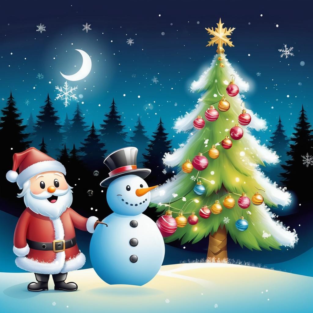 将椰子树转换为一棵装饰有圣诞灯的圣诞树,树上的笑脸可以被描绘成圣诞老人和雪人的形象。背景可以添加雪花纹理,并在树周围放置一些雪地装饰,如礼物盒和小鹿。使用暖色调的灯光和柔和的色彩过渡,营造出节日的欢乐氛围。