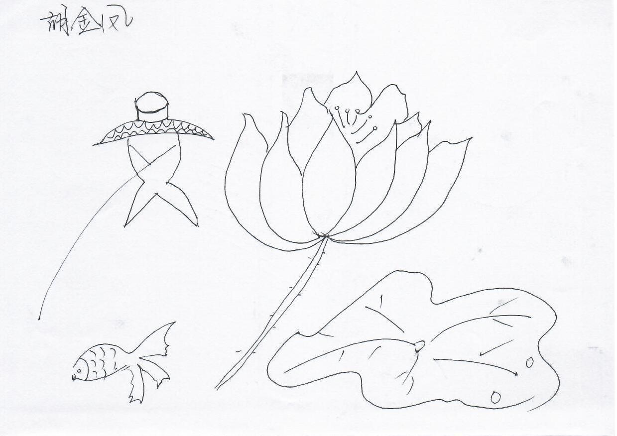 这幅画是手绘线稿,包含人物、莲花、鱼和荷叶元素。人物造型简约,具有抽象艺术风格,姿态静止,头部有类似帽子的装饰。画面缺乏明显的圣诞元素,如雪景或灯光装饰。可以利用莲花的对称性和鱼的流动感来创造节日氛围,结合圣诞元素,如雪花和灯光效果。