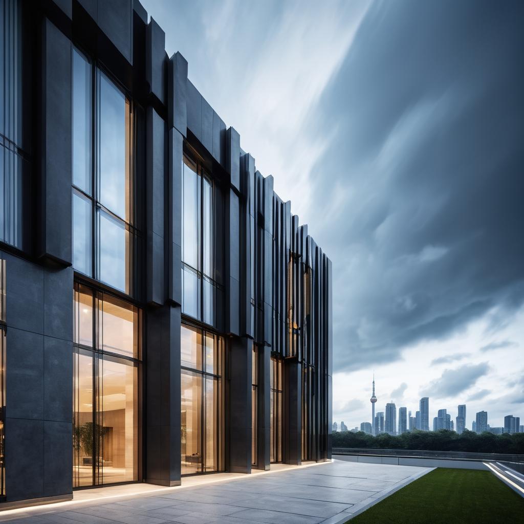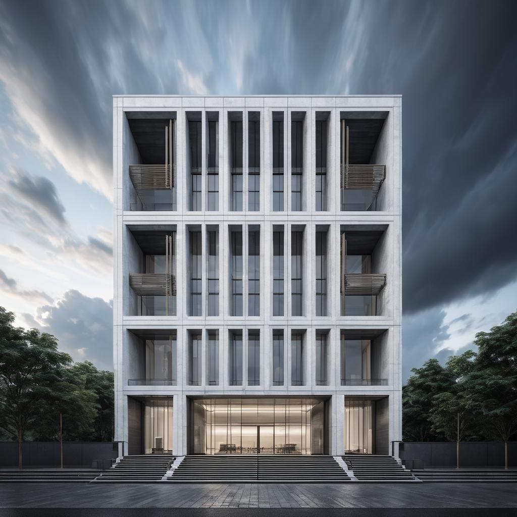 這幅作品展示了一座現代建築的外觀,主要顏色為白色和灰色,對比鮮明。建築物的設計帶有簡約現代的風格,結合了傳統元素,如門窗上的木質格柵。畫面中有著厚重的雲層,為圖像增加了自然的動態感。主要的情感表達是穩重和現代感,建築本身可能傳達了一種開放、包容的理念。