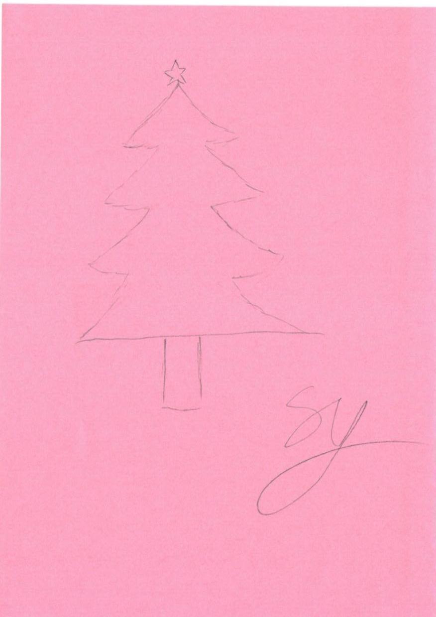 这幅图片是一张简单的圣诞树手绘草图,背景为粉色纸张。图中没有人物,但有一个简单的圣诞树轮廓,上方有一颗星星。缺乏典型的节日元素如雪景或灯光装饰,但可以通过色彩和装饰细节的添加来增强其节日氛围。整体构图简单,线条流畅。