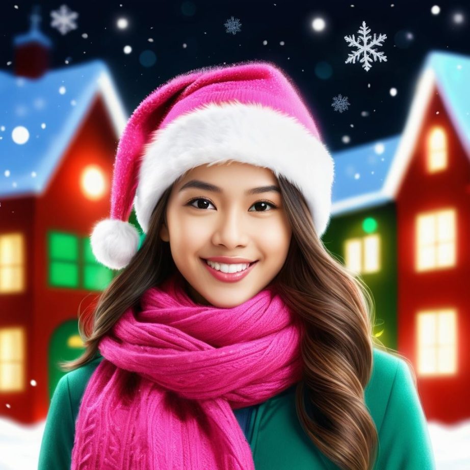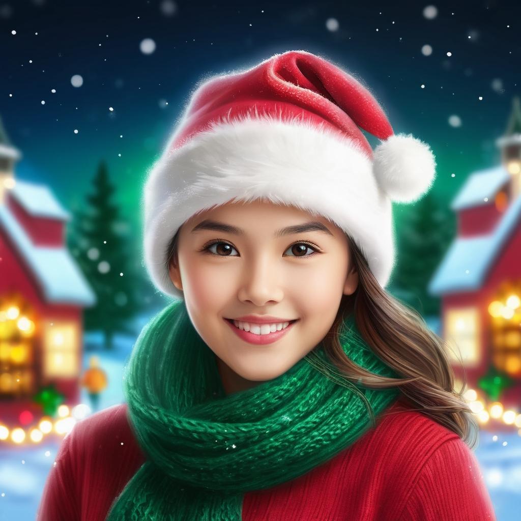 可以将人物的面部特征作为贺卡的中心,添加圣诞帽和围巾等节日服饰。背景可以设计成夜空中飘雪的场景,加入闪烁的圣诞灯饰。粉色背景可以被柔和的雪景或暖色灯光取代,营造温馨的节日气氛。