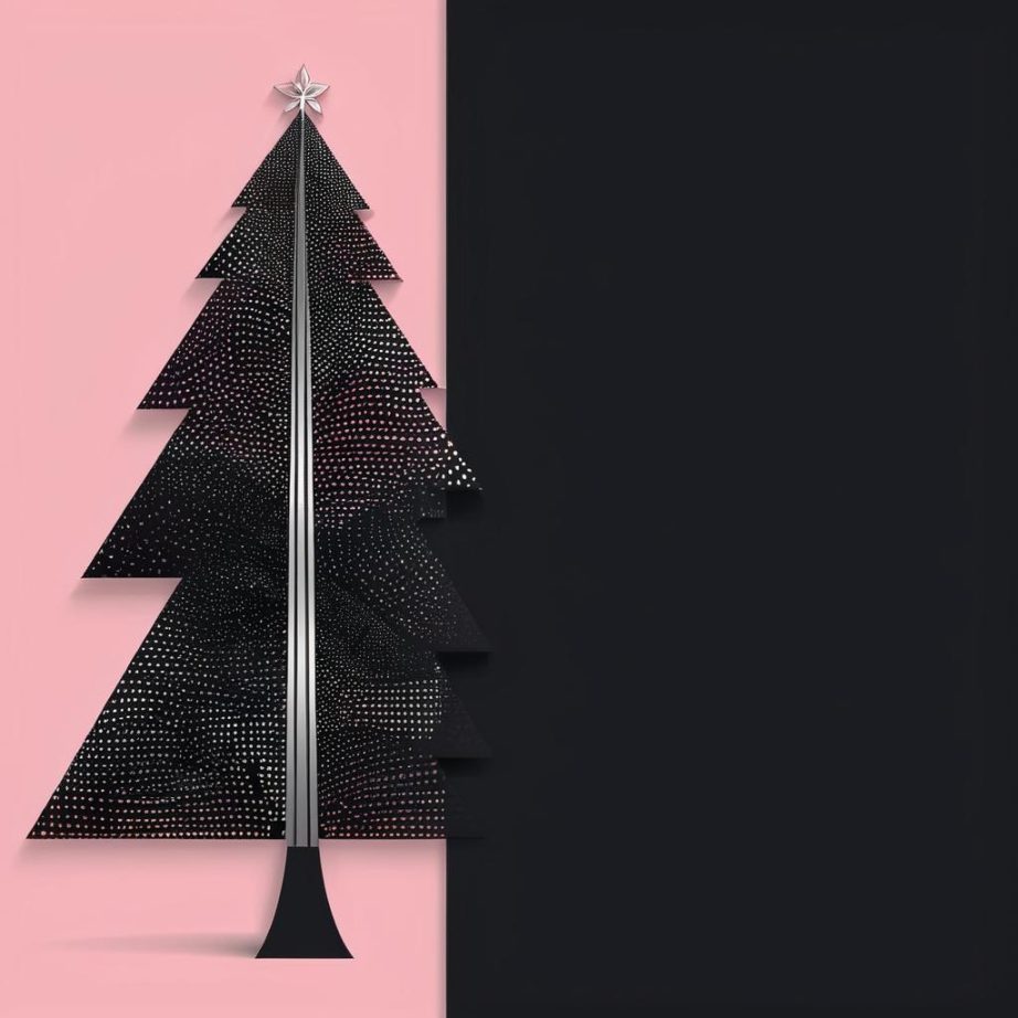 可以将黑色线条想象为圣诞树的轮廓,在其上点缀微小的金色和银色圆点,象征灯饰。背景的粉色与金色装饰相结合,营造出温暖的节日氛围。添加雪花点缀以增强画面的层次感和节日意境。