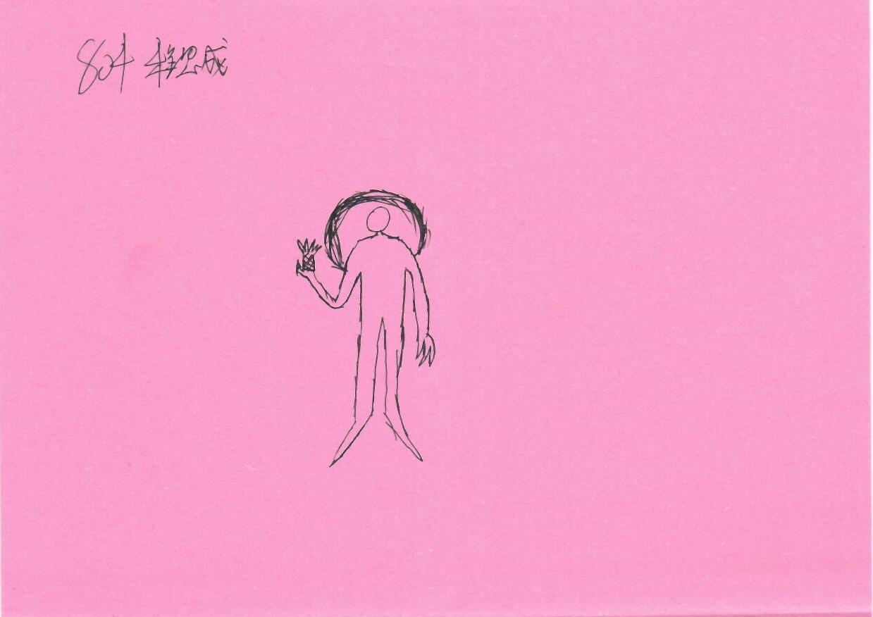 图中有一个简单的线条人物,姿态直立,右手似乎握有一个物品,背景为单一的粉色。人物的头部有一个环状图案,可能象征光环或装饰。整体设计较为简约,缺乏明显的节日元素。