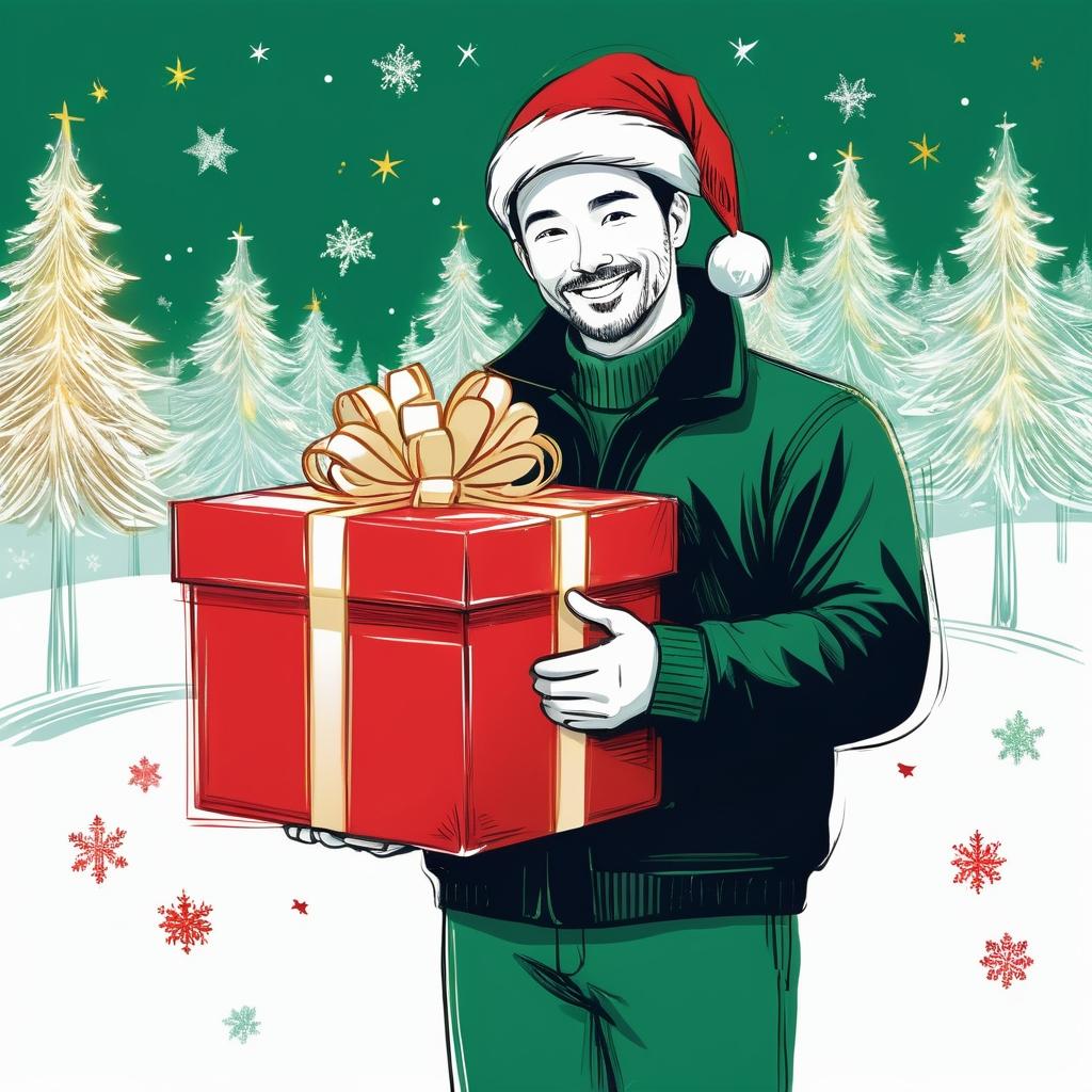 在这幅简约的线条画中,我们看到了一个可以转化为圣诞节贺卡的绝佳设计基础。尽管图像中缺乏直接的节日元素,但通过创造性的转化,我们可以将其打造成充满节日温暖的作品。首先,将人物周围的环状图案转化为圣诞花环,象征节日的团圆与喜庆。同时,在人物手中加入一个小礼物盒,传递节日的赠礼与祝福。背景则可使用细腻的雪花和金色星光,营造出温馨而梦幻的节日氛围。通过这些转化,原本简单的线条画摇身一变,成为一张充满个性与情感共鸣的圣诞贺卡。