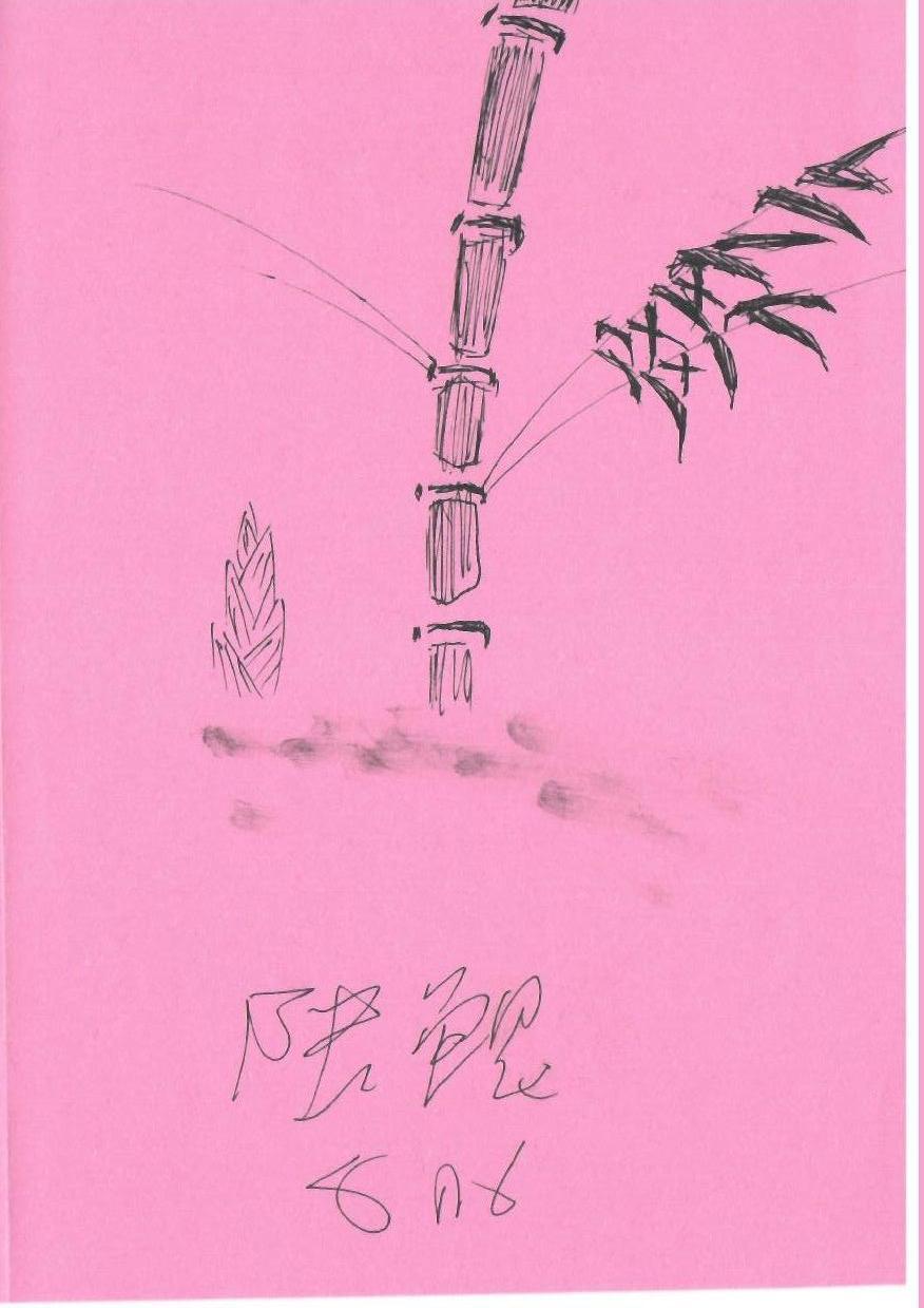 图片展示了一根竹子和几片竹叶,背景为粉色纸张。这幅简约的线条作品没有明显的人物或传统的圣诞元素。竹子的形象可以象征坚韧和宁静,提供了一种独特的视觉基础。色彩上缺乏圣诞节的代表色,但粉色背景可以被温柔地转化为节日的温馨感。