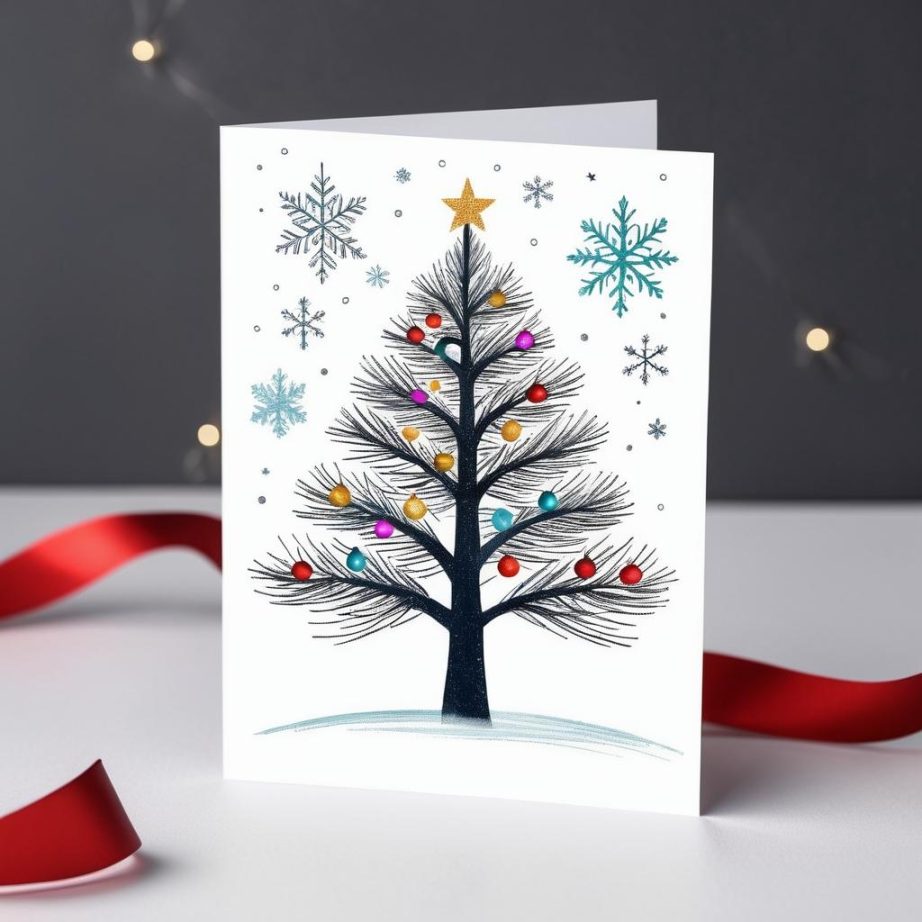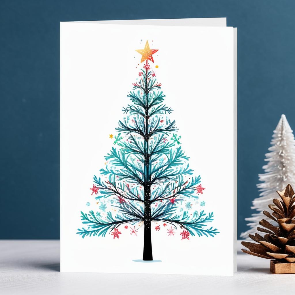 利用这幅图的简约风格,强化圣诞树和礼物的表现。可以通过添加彩色的灯饰和细腻的雪花纹理,使贺卡更具节日气氛。在背景中融入淡淡的星光或雪景,增加层次感和温馨感。使用柔和的色调,使整体设计既现代又富有节日情感。