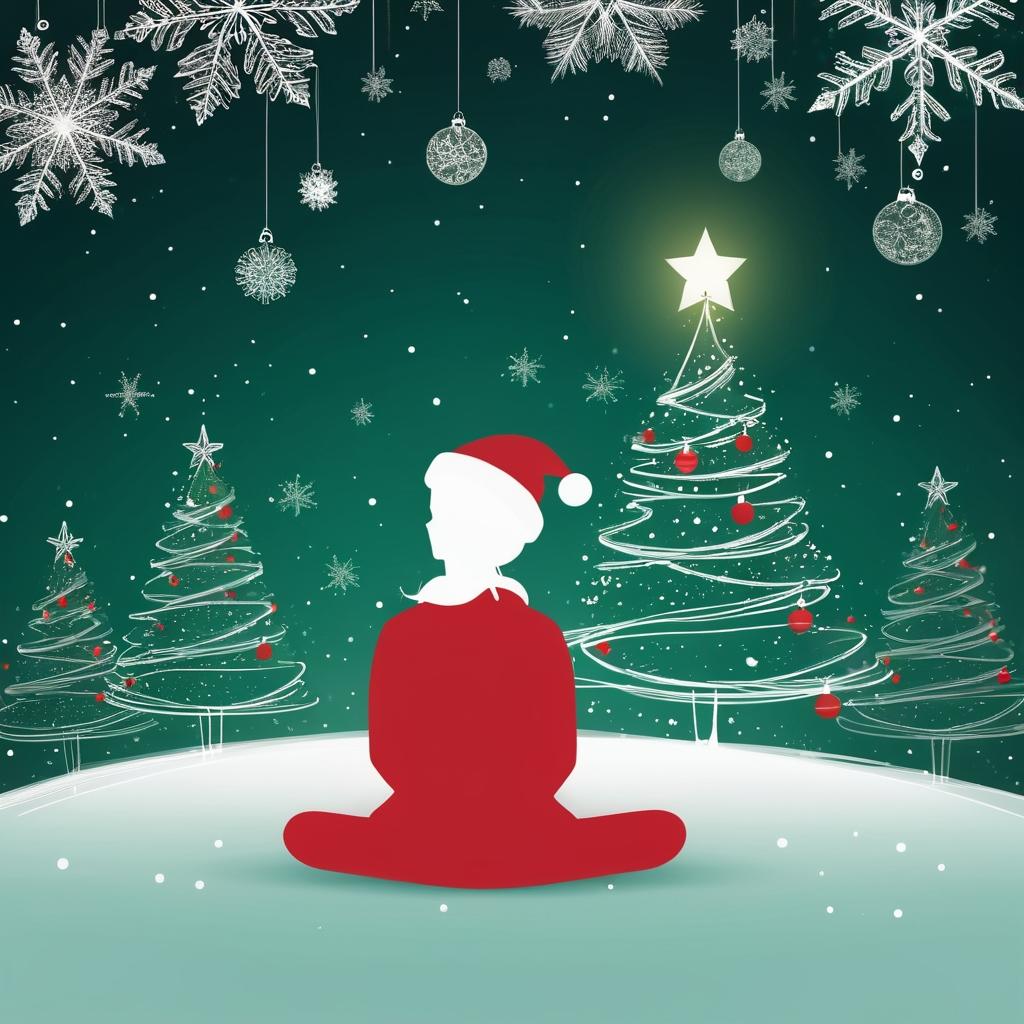 利用人物的简单轮廓作为创作的核心,将其姿态转化为一种温暖和内省的情感表达。可以在背景中加入柔和的雪花飘落效果,增添圣诞的宁静感。同时,加入一些微光灯饰和抽象的圣诞树轮廓,使用红、绿、金的色彩点缀,营造节日气氛。