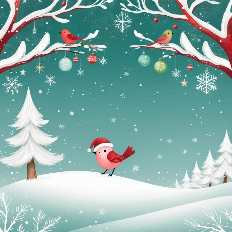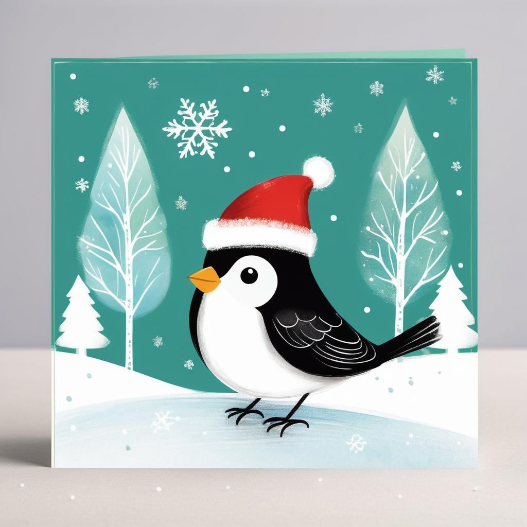 将鸟的形象转化为圣诞卡的核心,添加圣诞帽和围巾等节日装饰。背景中可以加入雪花和挂满灯饰的树枝,以增强节日气息。使用温暖的色调,如红色和绿色,强调圣诞氛围。