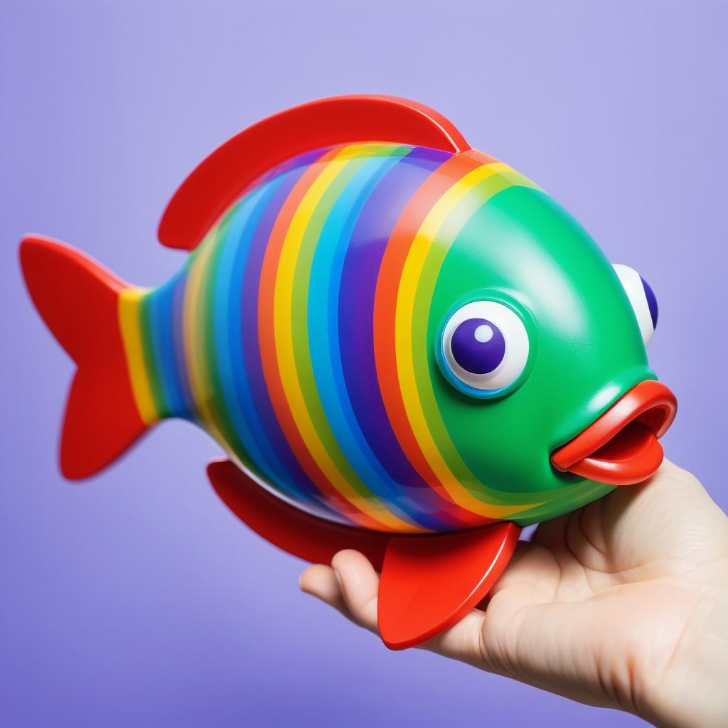 在现代艺术中,色彩的运用常常能直接影响观众的情感体验。这张图片展示了一只彩虹色的泡泡玩具,形状如鱼,色彩鲜艳且富有趣味性。通过运用红、橙、黄、绿、蓝、紫等多种颜色,这件作品不仅吸引了观众的视线,还在无形中传递了一种积极向上的情绪。这种设计特别适合儿童艺术领域,因为它能够激发儿童的视觉兴趣,同时也带来愉悦的情感体验。背景的模糊处理将观众的注意力集中在玩具本身,使其成为画面的焦点。为了进一步提升作品的艺术性,可以考虑在背景中加入柔和的自然景观或者儿童玩耍的场景,以增加其故事性和情感深度。此外,通过光影效果的变化,玩具表面的立体感可以得到增强,使其更加生动。这种色彩与光影的结合,不仅增加了作品的艺术层次,也使其在当代艺术中更具辨识度和情感共鸣。