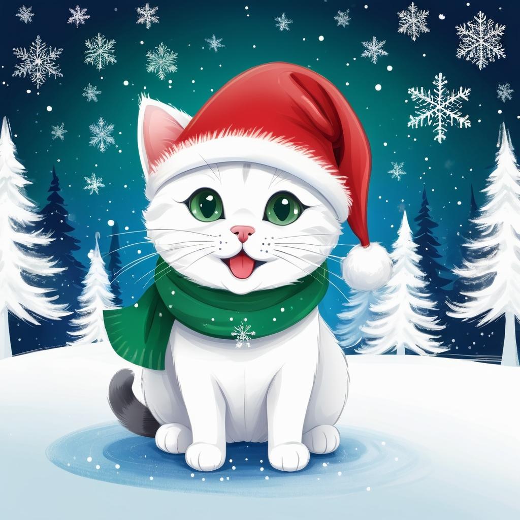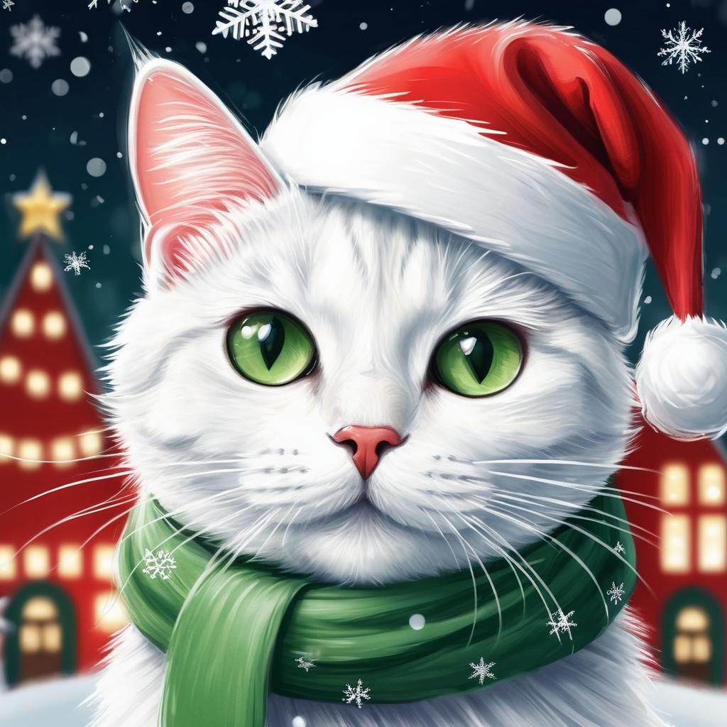 可以将这只小猫转化为圣诞卡的核心角色,赋予其圣诞帽和围巾等节日元素,增加其节日氛围。背景可以添加柔和的雪花和圣诞灯饰,营造温馨的节日气氛。色彩上可以引入红色和绿色,以增强圣诞主题。