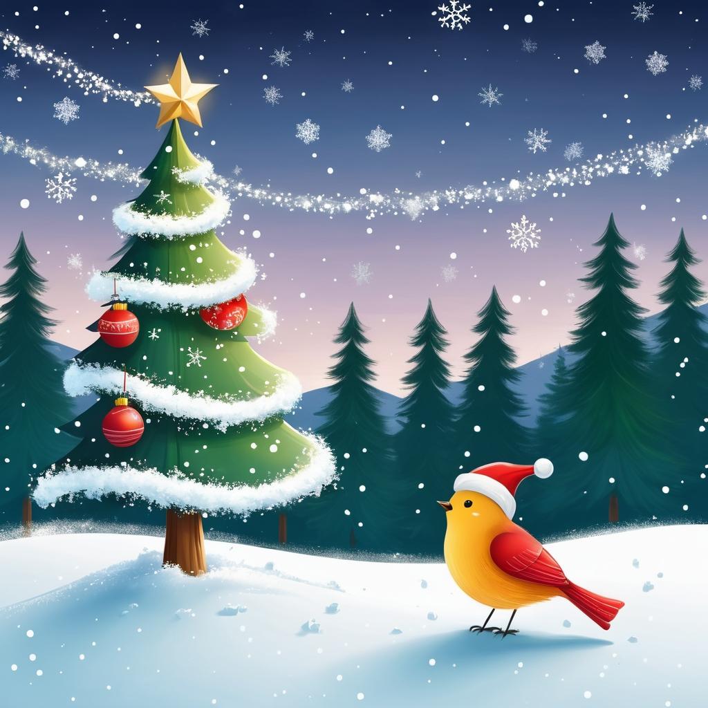 可以将这只小鸟拟人化,配上圣诞帽和围巾,站在雪地上。背景可以添加一个装饰着灯光的圣诞树和一些飘落的雪花,增强温暖和节日气氛。使用柔和的灯光效果和暖色调的色彩,为画面增添节日的温馨感。