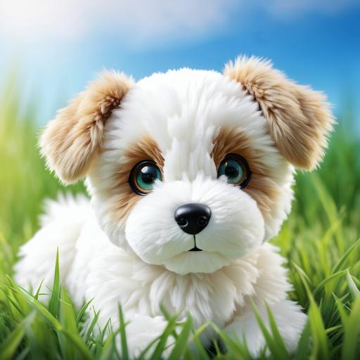 这是一张展示毛绒玩具狗的特写照片。玩具狗的主要颜色是白色和棕色,毛发细腻且富有层次感,背景模糊,突出主体。玩具的眼睛炯炯有神,呈现出一种温暖而友好的情感。整体构图简单,聚焦于玩具狗的面部特征。