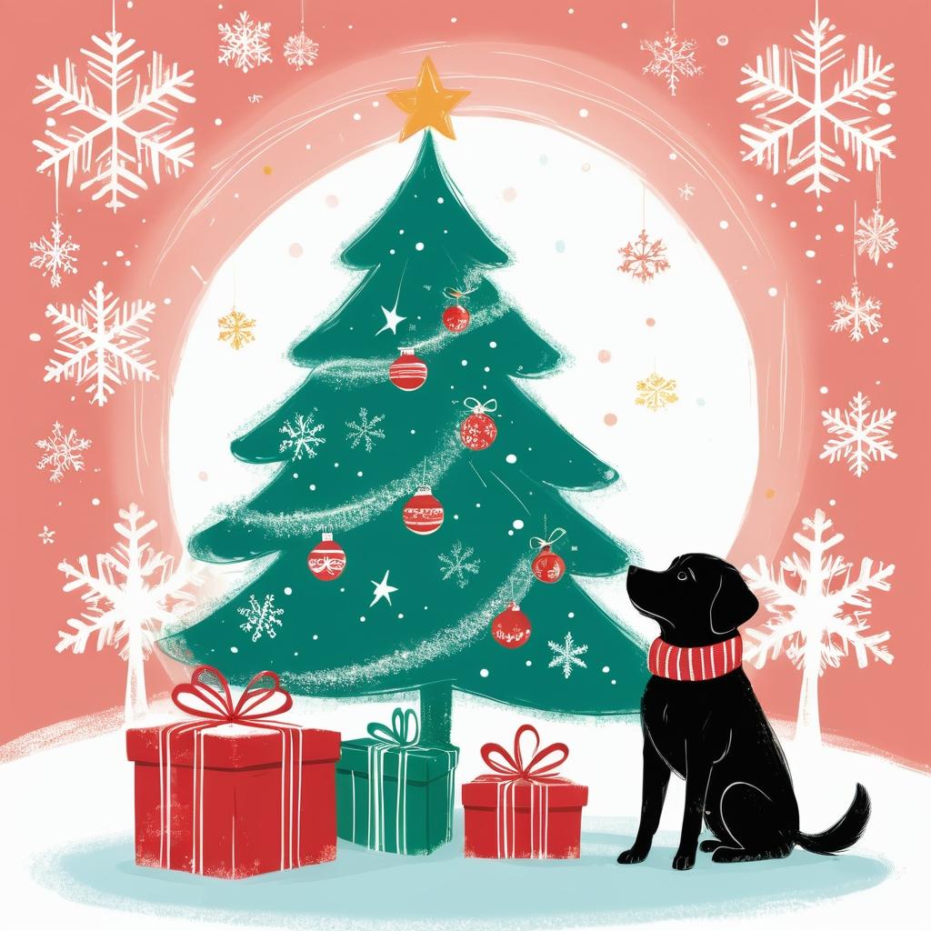 结合简笔画的可爱风格,保留宠物狗的面部表情和动作,添加耶诞元素如圣诞树、雪花和礼物盒,营造温暖的节日氛围。通过简单的线条和色彩搭配,设计宠物与孩子互动的场景,如在圣诞树下玩耍或拆礼物。