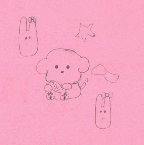 这幅插画以简约的线条风格勾勒出一个可爱的宠物角色,中心是一只小狗,简洁的线条和可爱的造型令人感到温暖。周围有星星、蝴蝶结和兔子形状的元素,添加了趣味性。整体色调柔和,背景使用粉色纸张,传递出一种轻松愉悦的氛围。