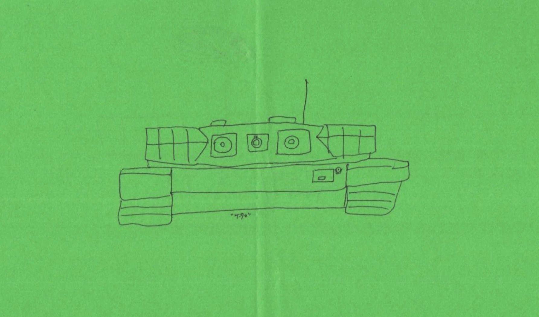 原图为一幅简单的线条画,描绘了一辆坦克,背景为绿色。线条简洁,整体风格为手绘。由于缺少明显的宠物或耶诞节元素,需从线条的简单构图中寻求创作灵感。