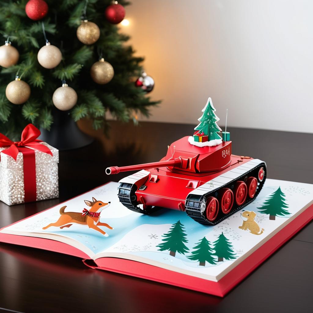 将坦克的元素转化为充满童趣的耶诞场景,例如将坦克装饰为巨大的耶诞礼物,添加雪花、礼物和彩灯等元素。可以在坦克周围放置玩具宠物,营造温馨的节日氛围。