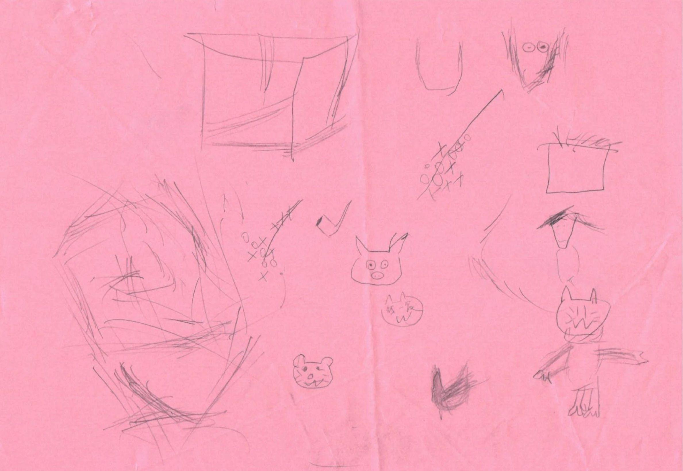 这幅图呈现了一些简单的手绘线条,可能是儿童的涂鸦作品。图中包含一些动物面部的简笔画,如猫和熊,可能代表宠物。没有明确的宠物用品或耶诞节元素。线条风格比较随意且富有童趣,整体色调以粉红色为主,较为柔和。可以从这些简笔画中提取出角色的基本形象,用于进一步设计。