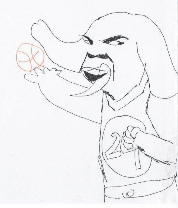 这幅图呈现了一个拟人化的角色,结合了犬类特征与运动元素。线条简单,具有卡通风格,角色穿着带有数字的运动背心,似乎在进行篮球运动。画面中缺少明显的耶诞节元素和宠物用品。