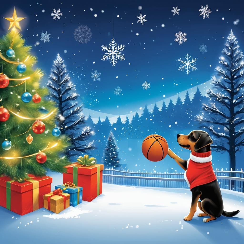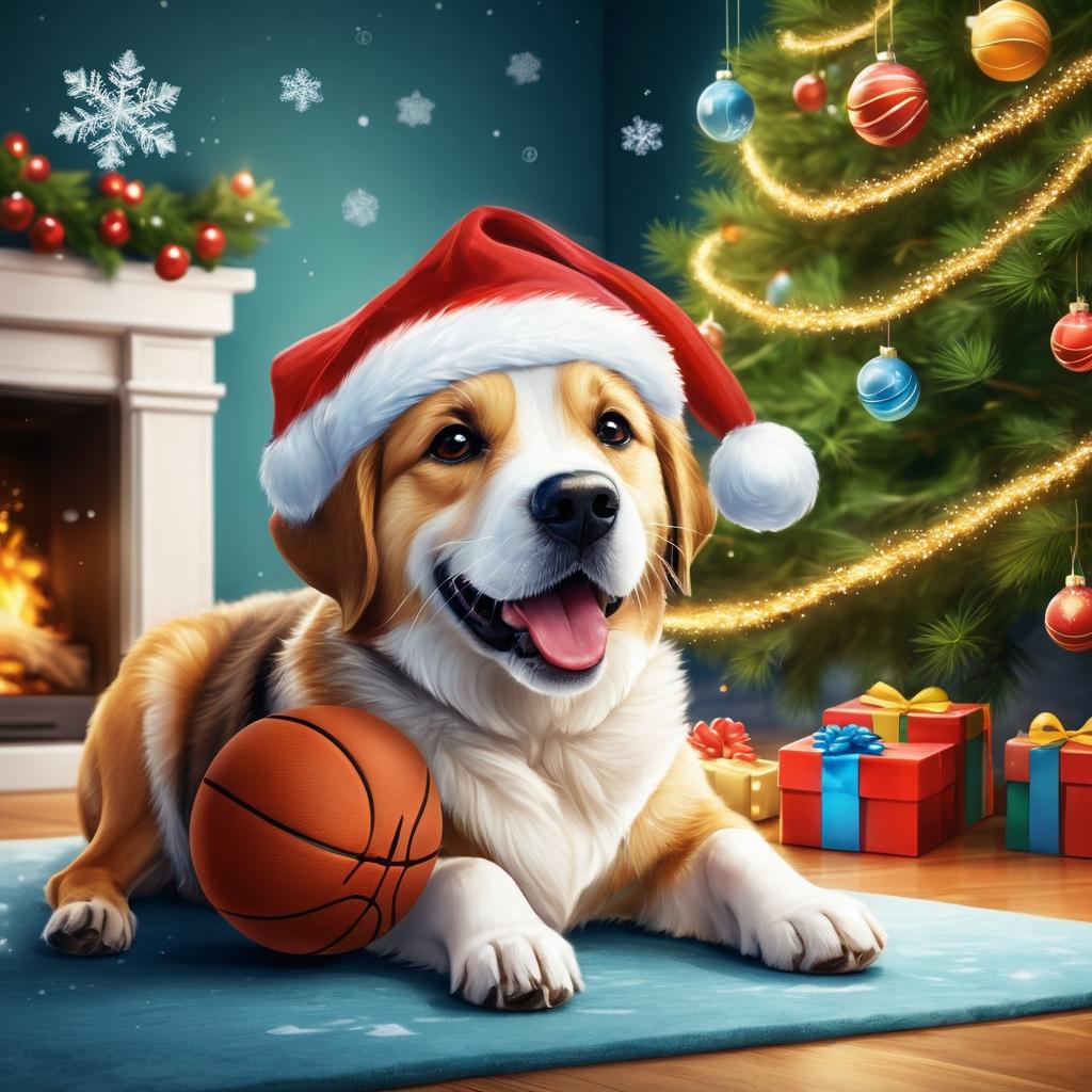 将角色转变为一只戴着圣诞帽的卡通狗,正在与孩子们玩耍。设计一个温暖的节日场景,如在圣诞树下打篮球。可以加入节日装饰,如闪烁的灯串和雪花背景,增强节日气氛。