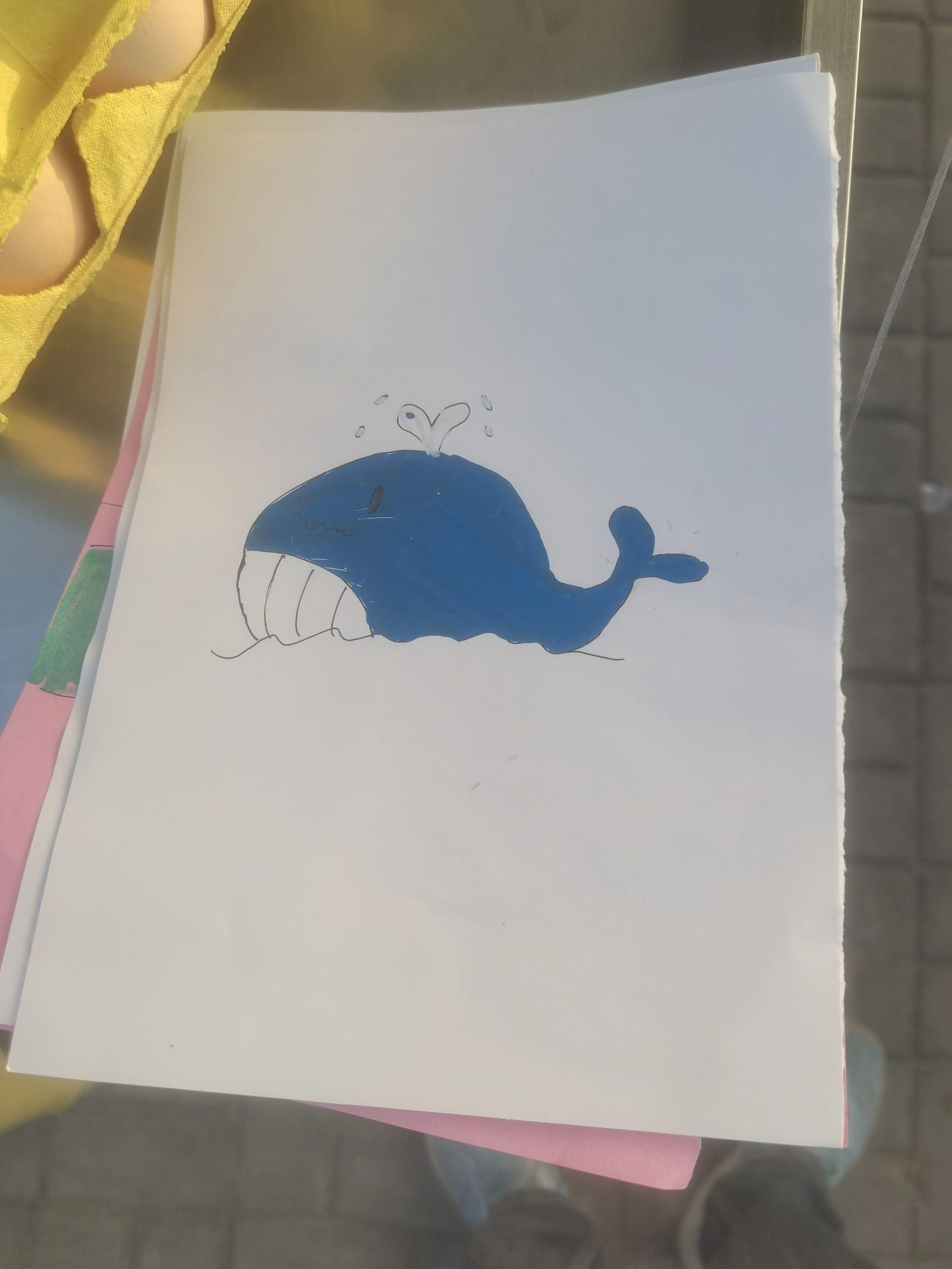这幅作品展现了儿童艺术作品中常见的元素——简单的线条和鲜艳的色彩。画中的鲸鱼以一种可爱的方式呈现,仿佛在无忧无虑地畅游海洋。这种表现手法不仅仅是对海洋生物的简单描绘,更是对童真和快乐的传达。通过加入海洋背景和其他生物,可以使画面更加丰富和生动。同时,使用不同的色彩层次能够为画面增添深度,吸引观者的目光。儿童艺术作品的重要性在于它们能够激发想象力和创造力,而这幅作品正是这样一种成功的表达。