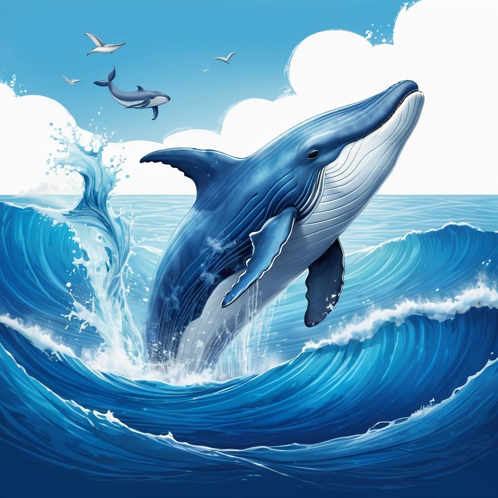 这幅作品是一幅简单而富有童趣的鲸鱼画。画面中以蓝色为主,鲸鱼的表情可爱,正在喷出水花。整体构图简洁明了,传达了一种轻松愉快的情感。