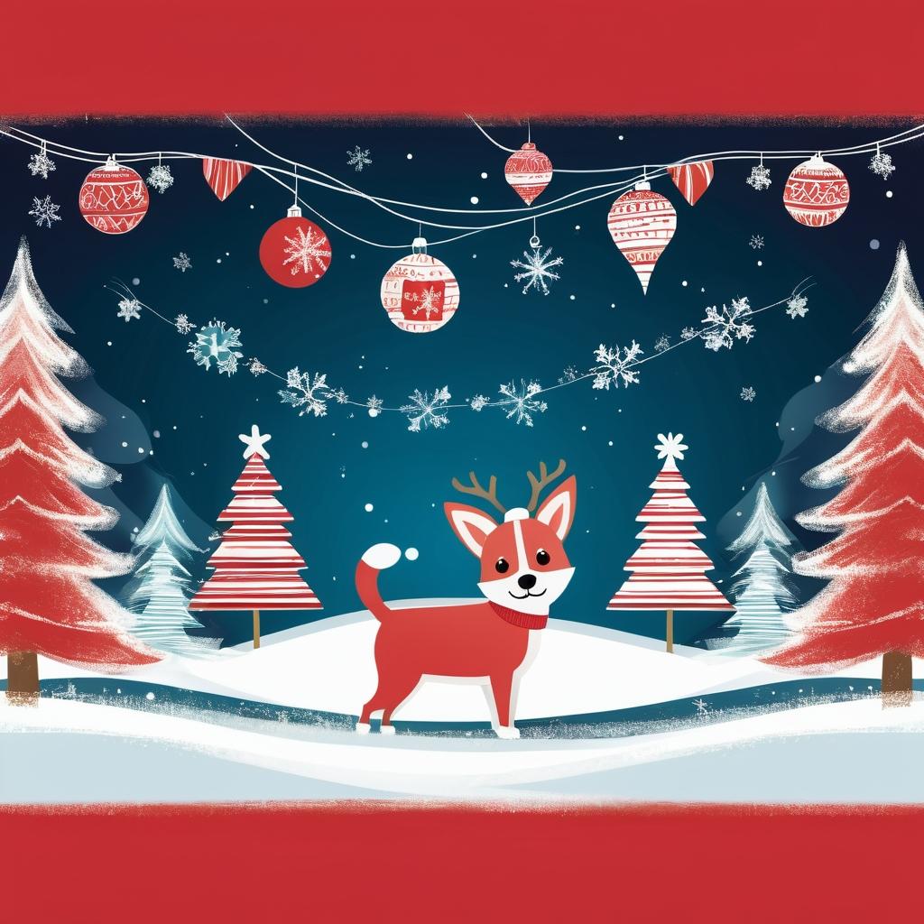 将图中不规则的形状转化为耶诞节场景中的山丘或雪地背景,在前景中添加宠物角色与耶诞元素,如戴着圣诞帽的宠物在雪地上奔跑,周围点缀着彩色的灯串或装饰。背景中的线条可以进一步发展为耶诞树的轮廓或礼物堆。