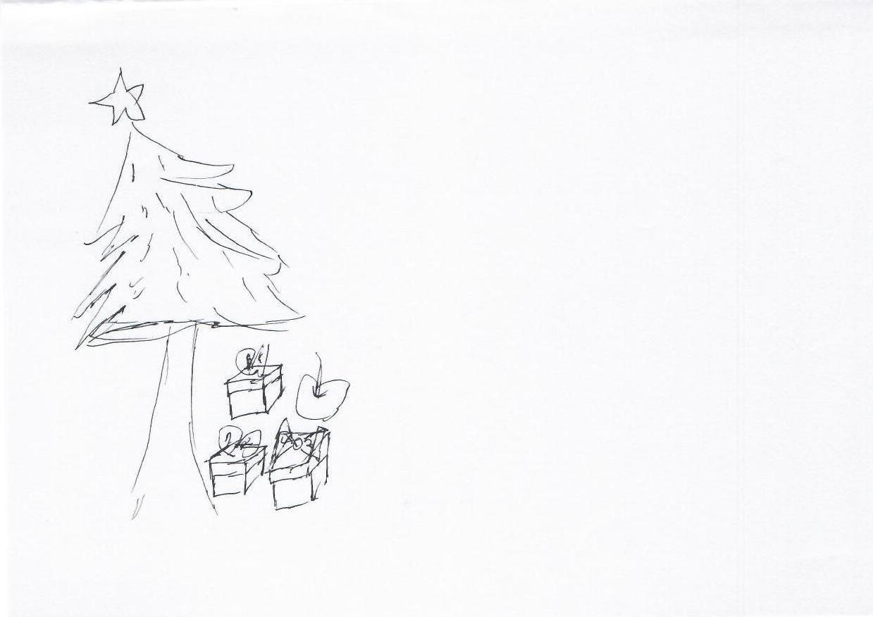 这幅图中有一棵简单勾勒的圣诞树,树下有几个礼盒,可能象征着宠物用品。这些礼盒以线条方式绘制,形状方正,顶部有丝带装饰。圣诞树上有一颗星星,增添了节日氛围。整体线条简洁,给人以手绘草图的感觉。
