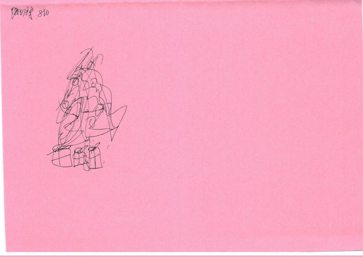这幅画使用了粉红色背景,上面有一个简单的线条草图。草图似乎描绘了一棵圣诞树和一些礼物盒。线条风格是非常松散和抽象的,以手绘方式呈现。虽然细节有限,但可以识别出基本的圣诞元素,像是礼物盒的形状。色彩基调温暖,主要是粉红色背景。