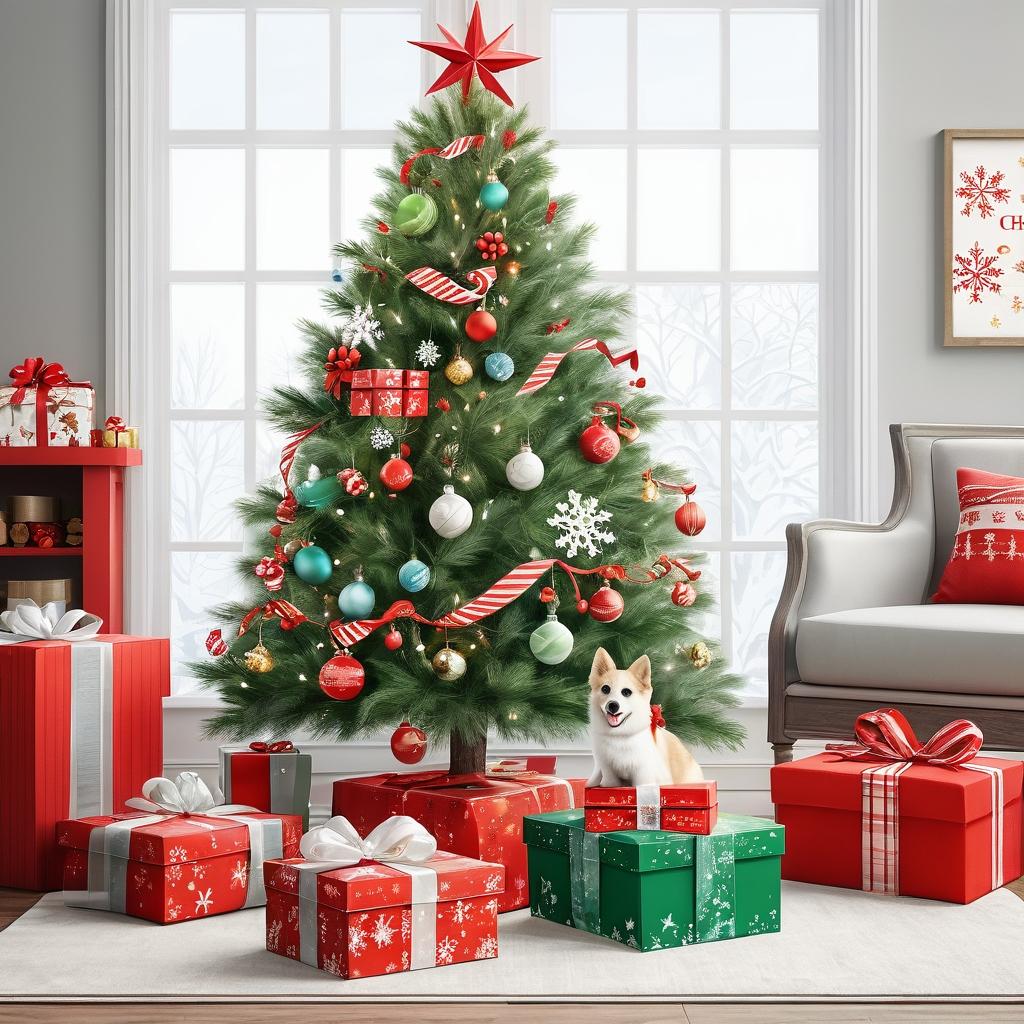 将这幅画中的圣诞树和礼物盒元素细化,设计成一幅充满细节的插画。可以添加宠物如小猫或小狗在礼物盒旁玩耍,背景中用温暖的灯光和雪花来增强节日气氛。通过细致的线条和丰富的色彩使场景更具童趣。