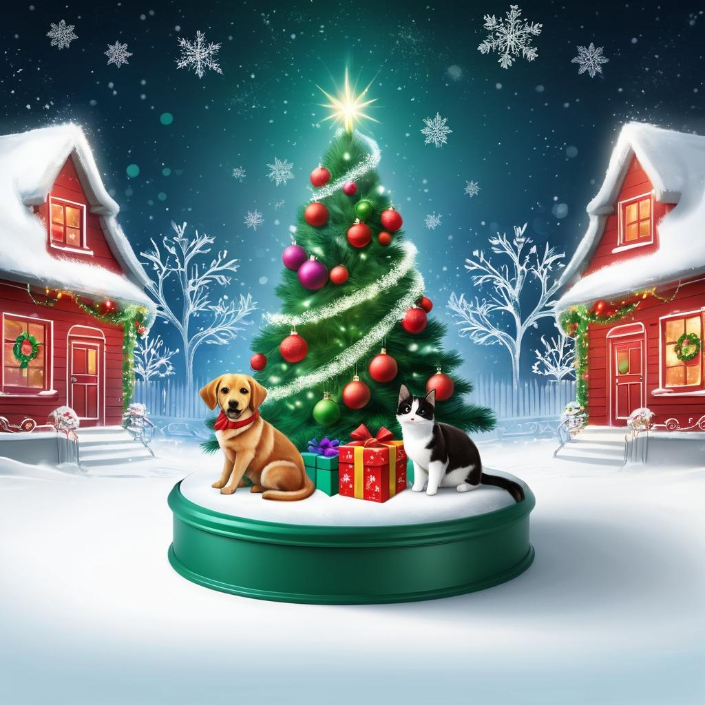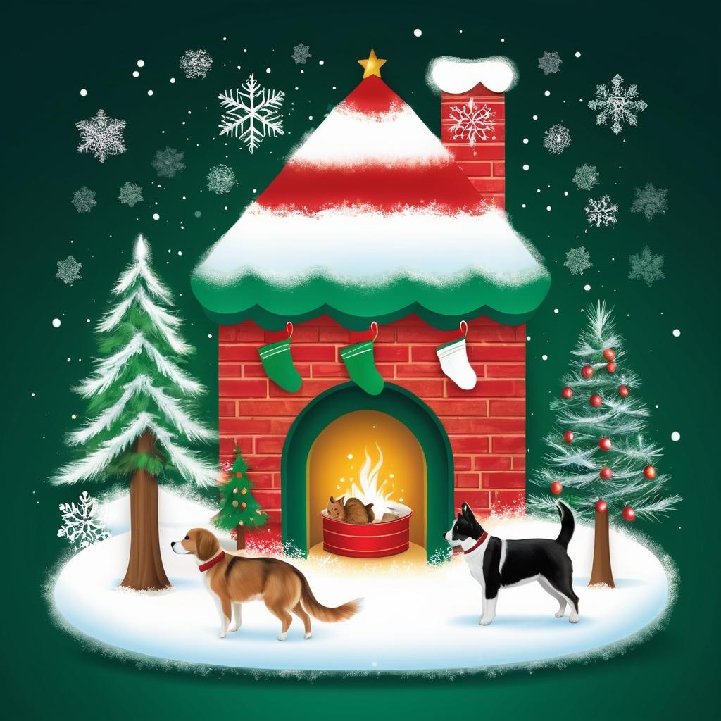 将图中形状转化为宠物的活动区域,例如一个装饰有圣诞彩带的宠物玩具笼。加入小动物在笼内外活动的场景,外围可设计成温暖的节日环境,如圣诞灯光和雪花飘落,营造出节日的氛围。